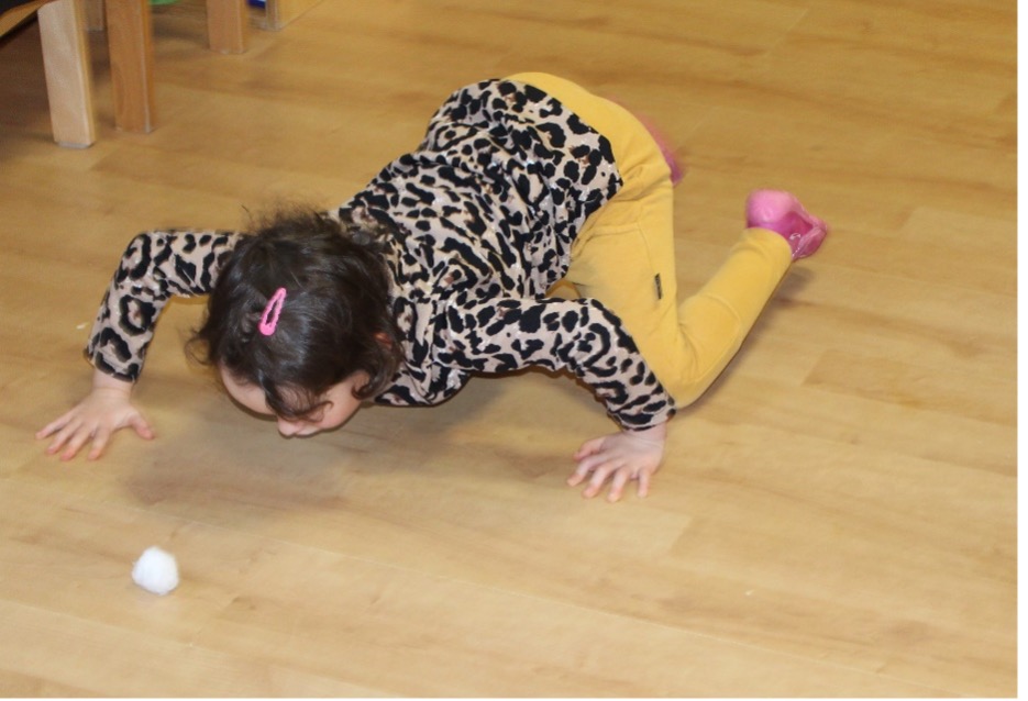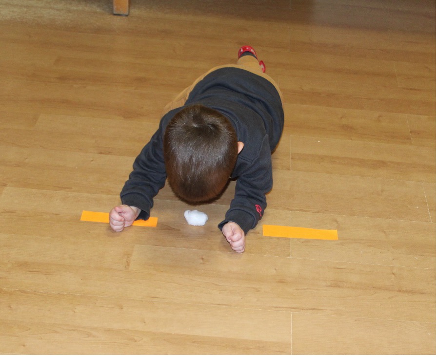 Dann ging es weiter zur zweiten Station: Schneeflockenpusten. Auf der Startlinie lagen kleine Watte-Schneeflocken. Die Aufgabe? Sie nur mit pusten über eine glitzernde Bahn bis ins Ziel zu bewegen! „PUUUSTEEE! machte es überall. Die Schneeflocken tanzten durch die Luft, landeten manchmal neben der Spur – und wurden schnell wieder eingesammelt. Es war gar nicht so leicht, aber alle hatten rote Wangen vor Lachen.