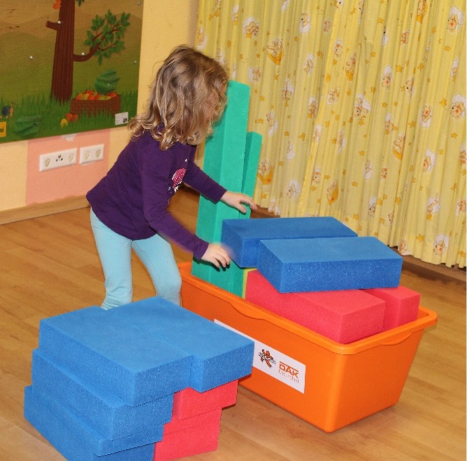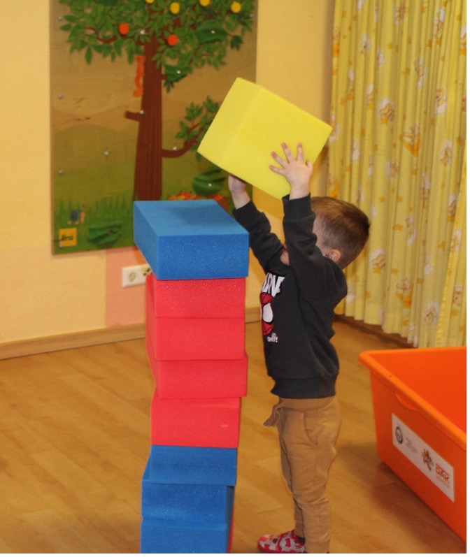 Die dritte Station war die kniffligste: Eisblockstapeln. Große, weiche Bausteine mussten zu einem möglichst hohen Turm gestapelt werden. Ganz vorsichtig… noch ein Block… und noch einer… . „Ohhhh!“ riefen alle, als ein Turm plötzlich wackelte. „Halt ihn!“ Zu spät – plumps! Aber beim nächsten Versuch stand er höher als zuvor. Teamarbeit machte eben stark!