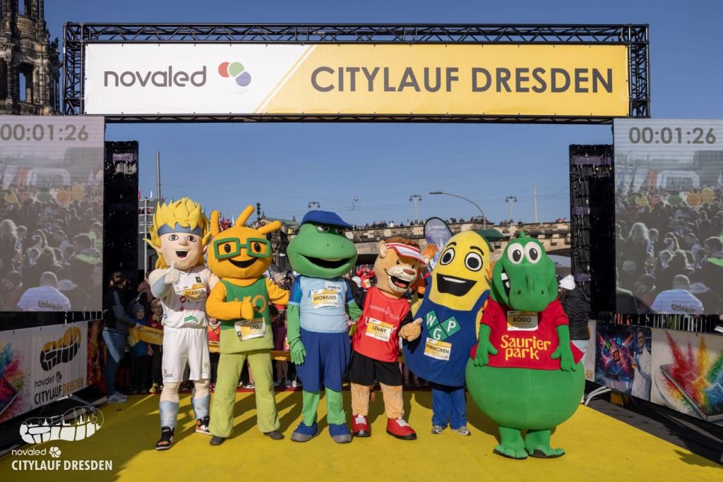 Das Maskottchen-Rennen beim Dresdner Citylauf ist kurz, aber besonders: Rund 200 Meter lang, gestartet direkt nach dem 2-km-Kinderlauf und noch vor dem 400-m-Bambinilauf. Die Maskottchen laufen dabei genau auf die an der Startlinie wartenden Kinder zu – die Startlinie wird in diesem Fall selbst zum Ziel, inklusive Siegerbanner, das durchlaufen werden muss.
