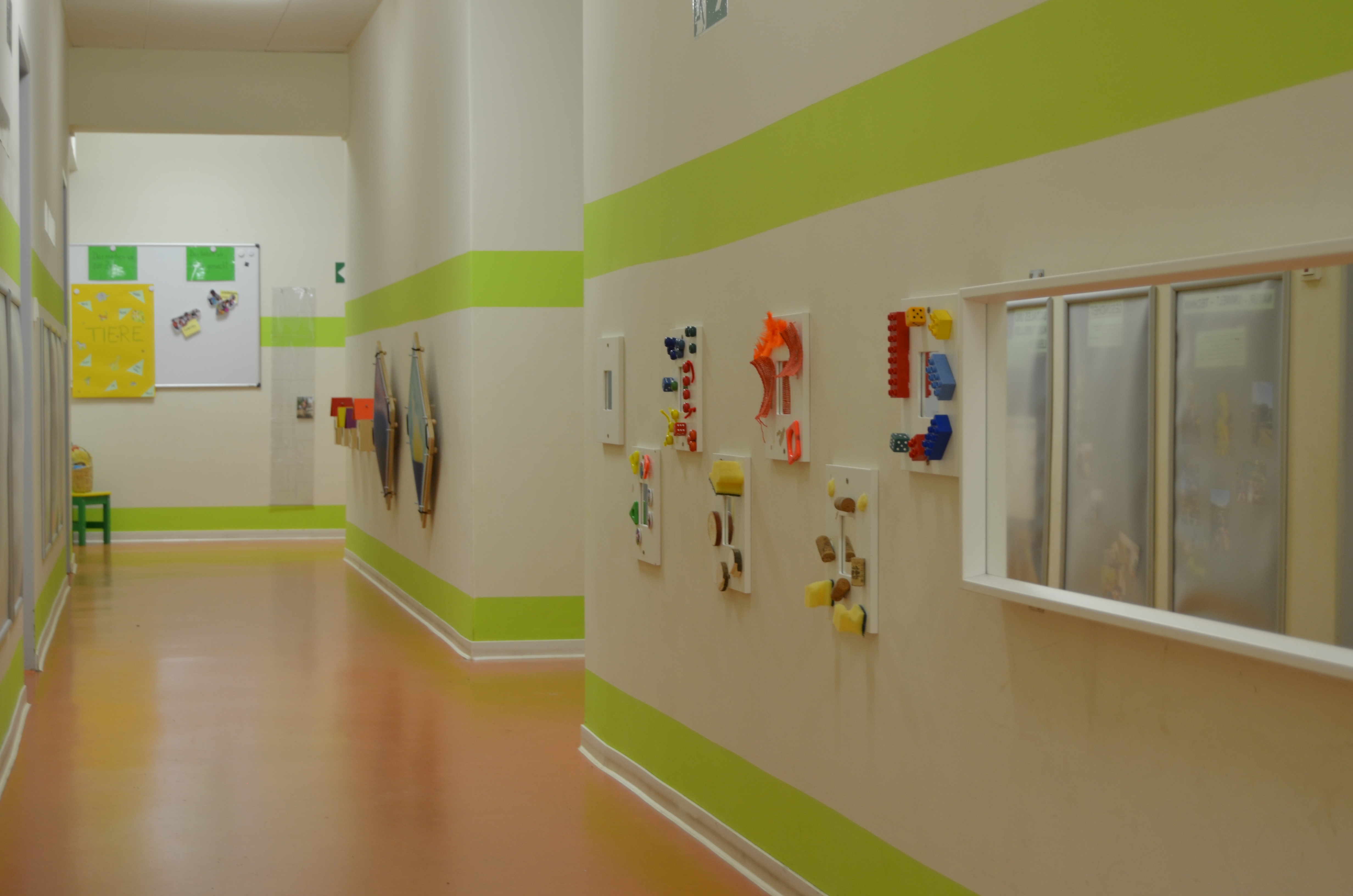 Unsere Einrichtung bietet auf drei Etagen Platz für 160 Kinder. Im Erdgeschoss befinden sich das Büro der Kitaleitung sowie der barrierefreie Nestbereich. Eine Etage tiefer, im Untergeschoss, liegen eine weitere Abteilung mit Elementarkindern, ein großer Bewegungsraum und eine Kreativwerkstatt. In der ersten Etage stehen den Kindern von drei Jahren bis zum Schuleintritt verschiedene Aktionsräume zur Verfügung, die sie partizipativ nach ihren Fähigkeiten und Interessen nutzen können.