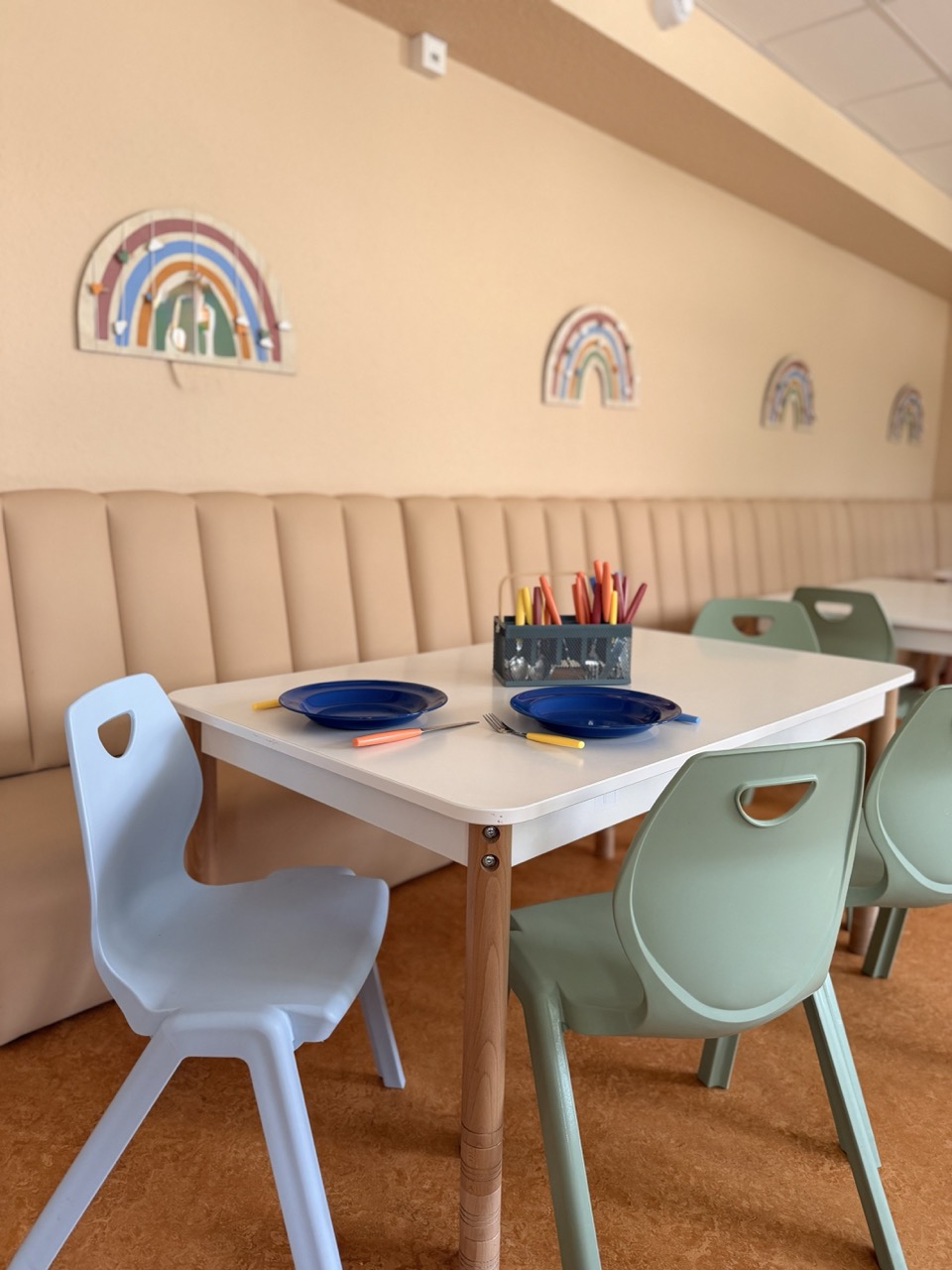 Das Haus ist über zwei Etagen als H-förmiger Bau angelegt. Der Mitteltrakt (Haus C) bildet den Verwaltungs- und Wirtschaftsbereich mit Leitungsbüro, den Förderräumen der Heilpädagog*innen, einer Ausgabeküche und unserem liebevoll gestalteten Kinderrestaurant mit Kinderküche. Hier essen die Kinder gemeinsam, pflegen soziale Kontakte und lernen Esskultur kennen. Zudem finden dort Angebote zur Essenszubereitung statt – gelegentlich auch gemeinsam mit Eltern.