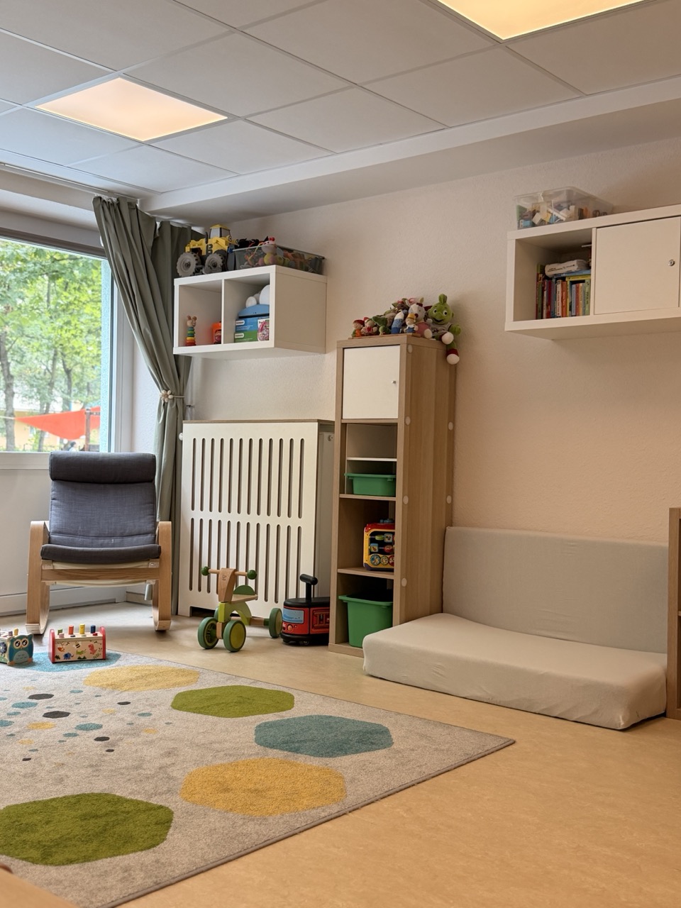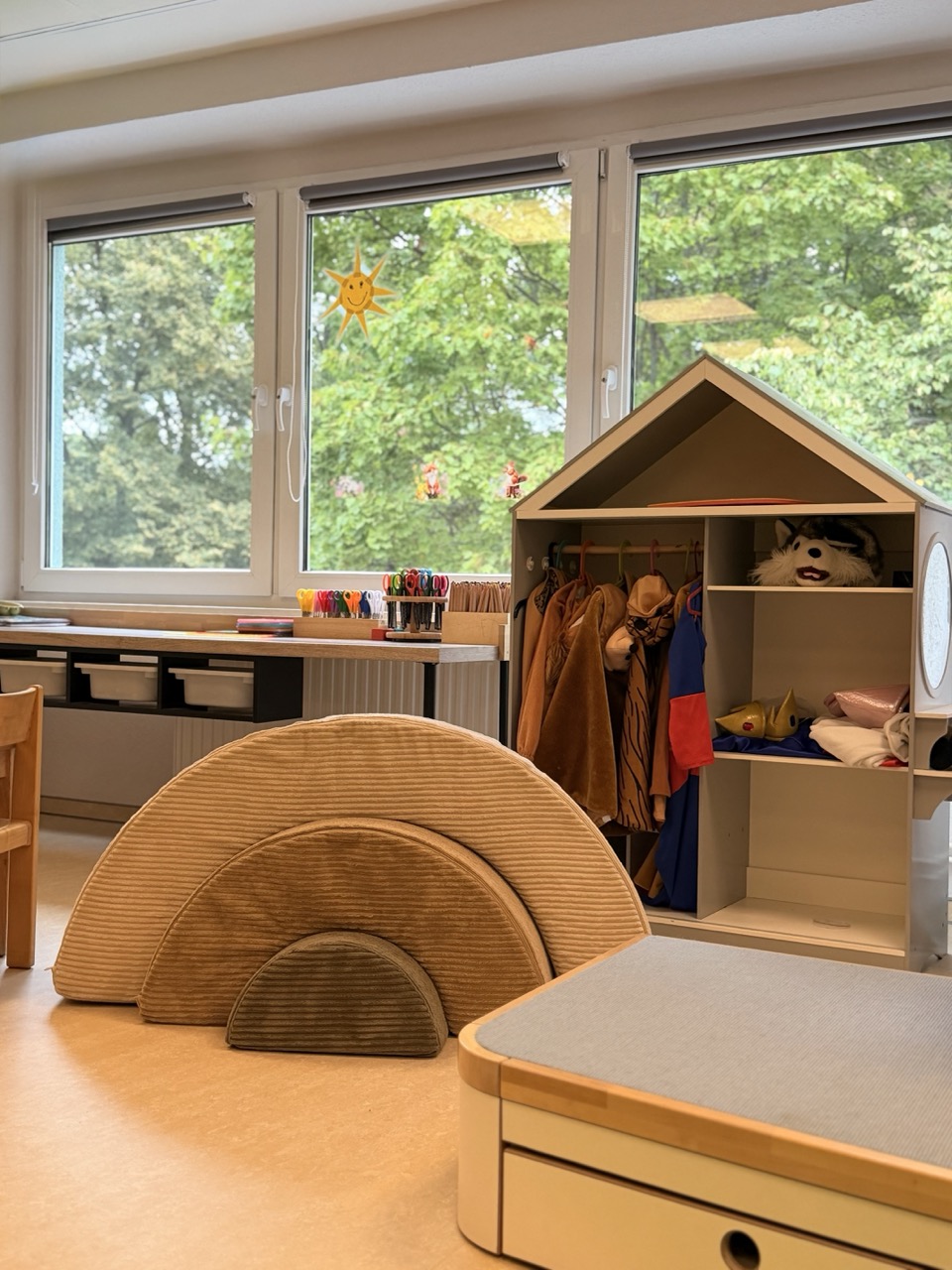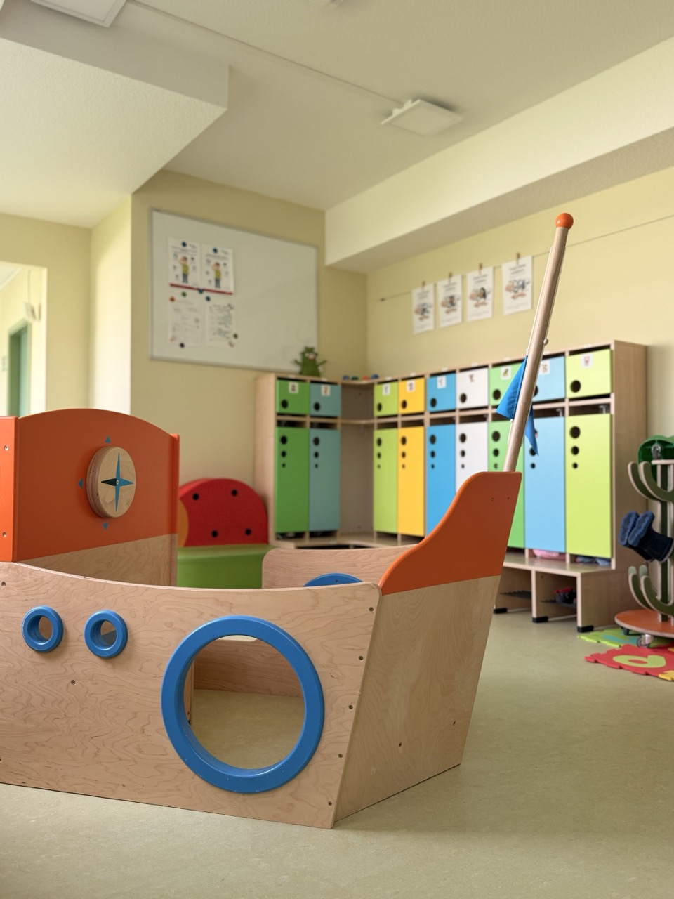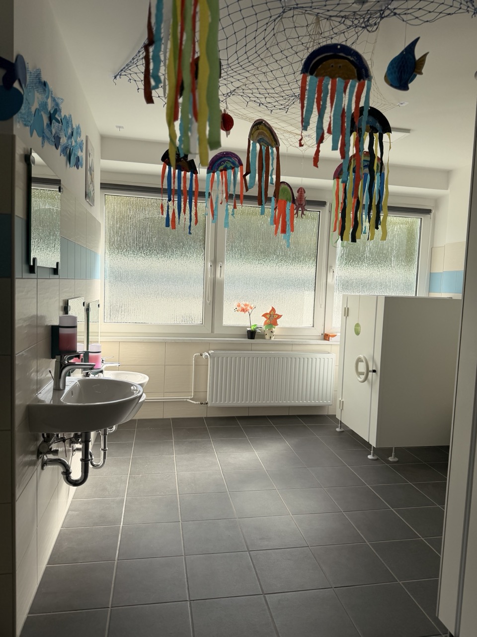 Die Einrichtung umfasst 14 helle, freundliche Gruppenräume, teils mit Verbindungstüren, die den Kindern vielfältige Möglichkeiten zum Spielen, Lernen und Entfalten bieten. Wir legen großen Wert auf pädagogisch durchdachte Raumgestaltung, die die Entwicklung der Kinder in allen Bereichen unterstützt. Jeder Gruppenraum verfügt über ein eigenes Bad und eine Garderobe.