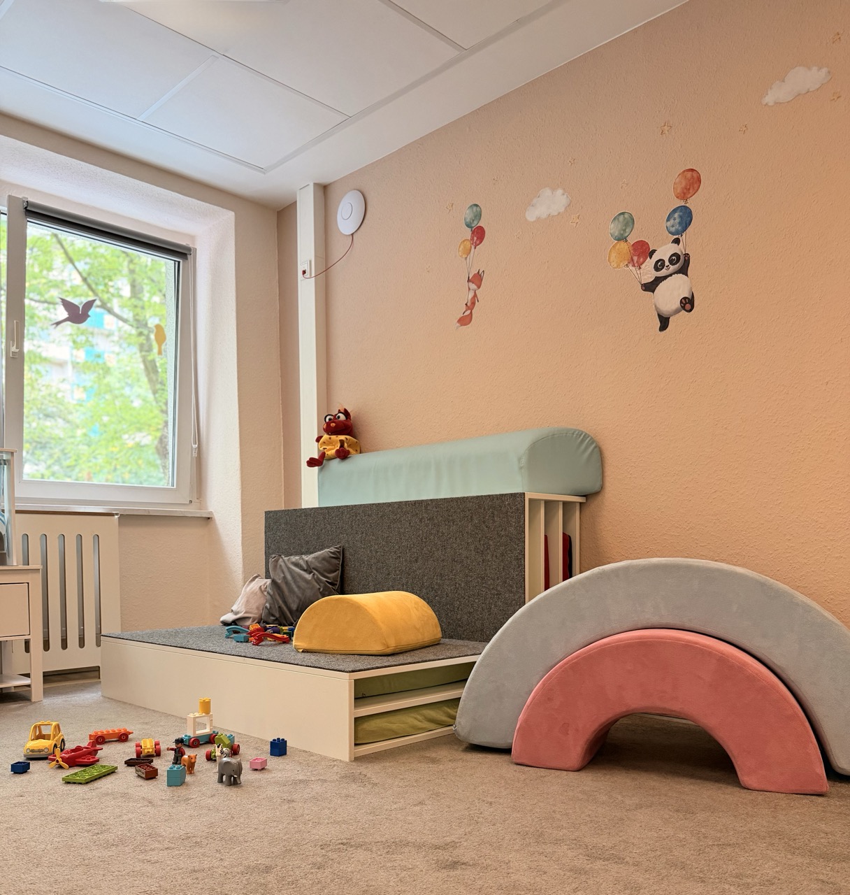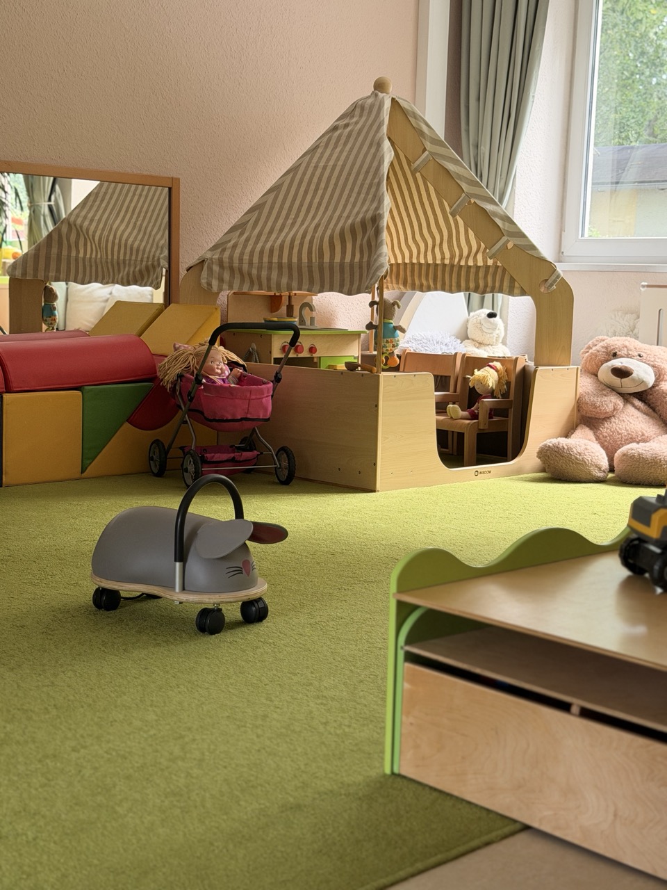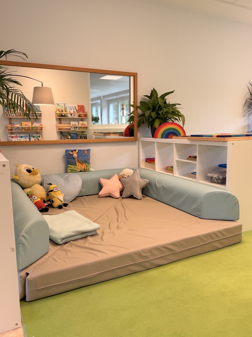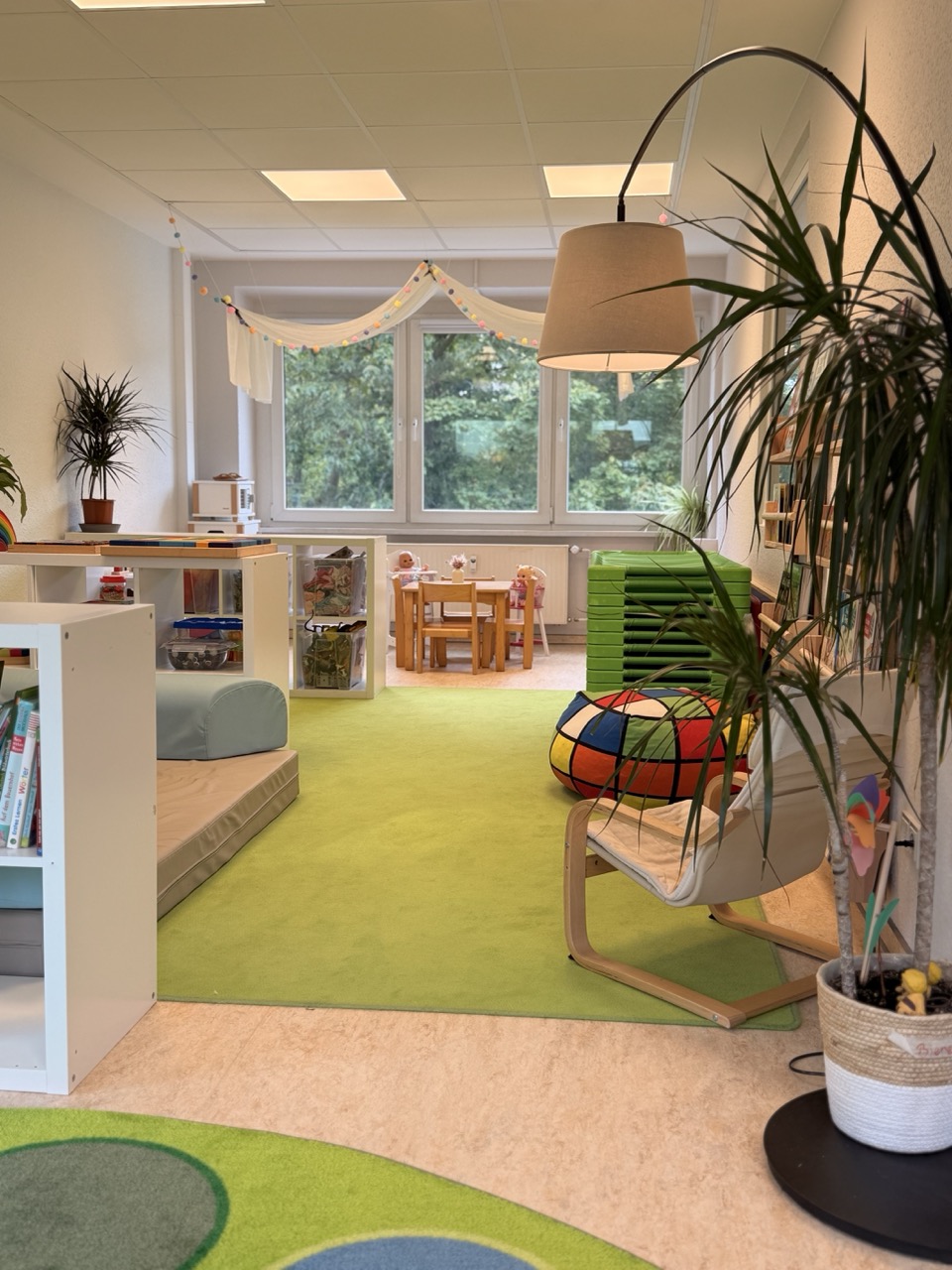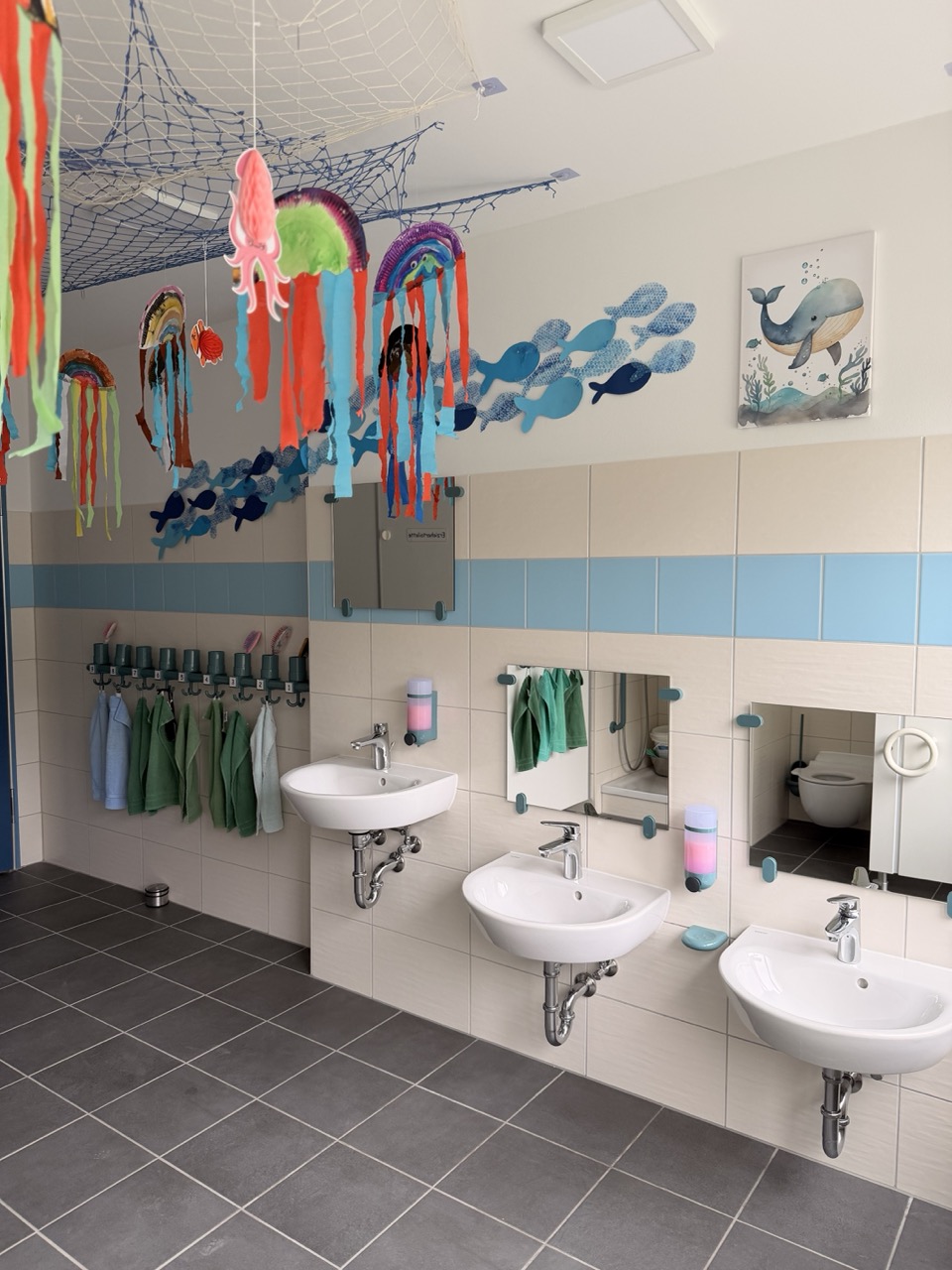 Die Einrichtung umfasst 14 helle, freundliche Gruppenräume, teils mit Verbindungstüren, die den Kindern vielfältige Möglichkeiten zum Spielen, Lernen und Entfalten bieten. Wir legen großen Wert auf pädagogisch durchdachte Raumgestaltung, die die Entwicklung der Kinder in allen Bereichen unterstützt. Jeder Gruppenraum verfügt über ein eigenes Bad und eine Garderobe.