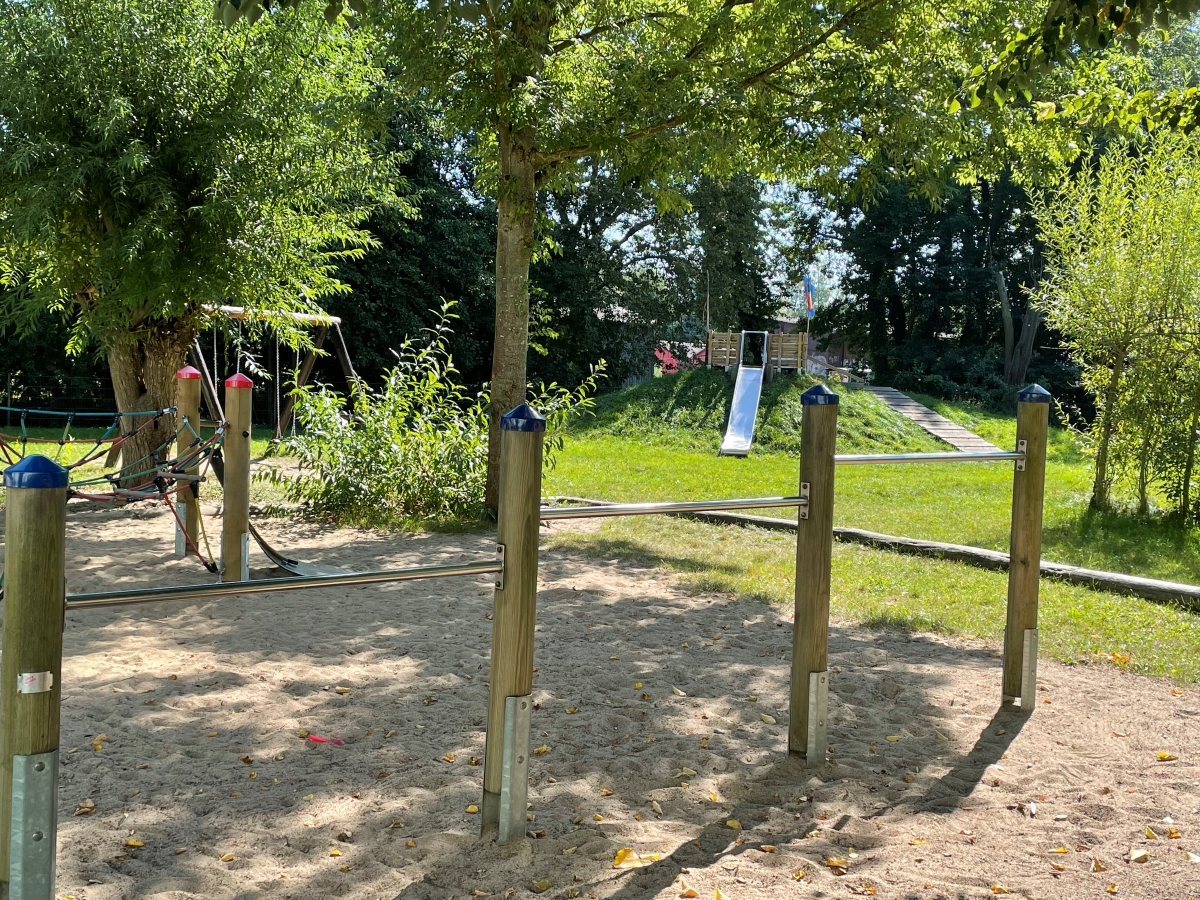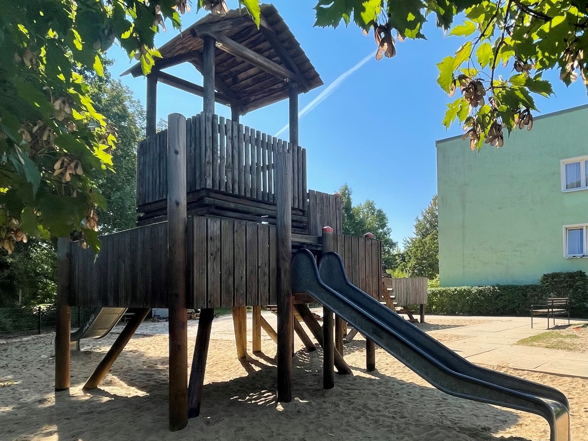 Unser großzügiges Außengelände ist vollständig eingezäunt – die Umzäunung wurde in zwei Bauabschnitten erneuert und 2019 vollständig abgeschlossen. Es bietet allen Altersgruppen vielfältige Bewegungs- und Spielmöglichkeiten: ein großer Kletterturm mit Riesenrutsche, Schaukeln, Balancierstrecken, eine Kletterpyramide, ein Rodelberg mit Hangrutsche, eine Fußballwiese mit Toren, ein Trampolin, Wipptiere, Turnreck, Seilgarten sowie zahlreiche Sandspielbereiche sorgen für abwechslungsreiche Aktivität.