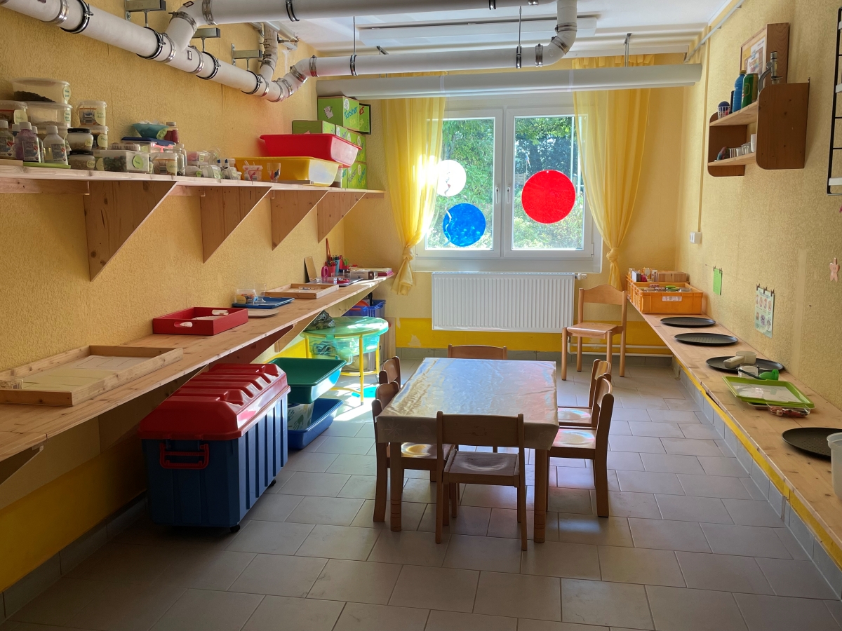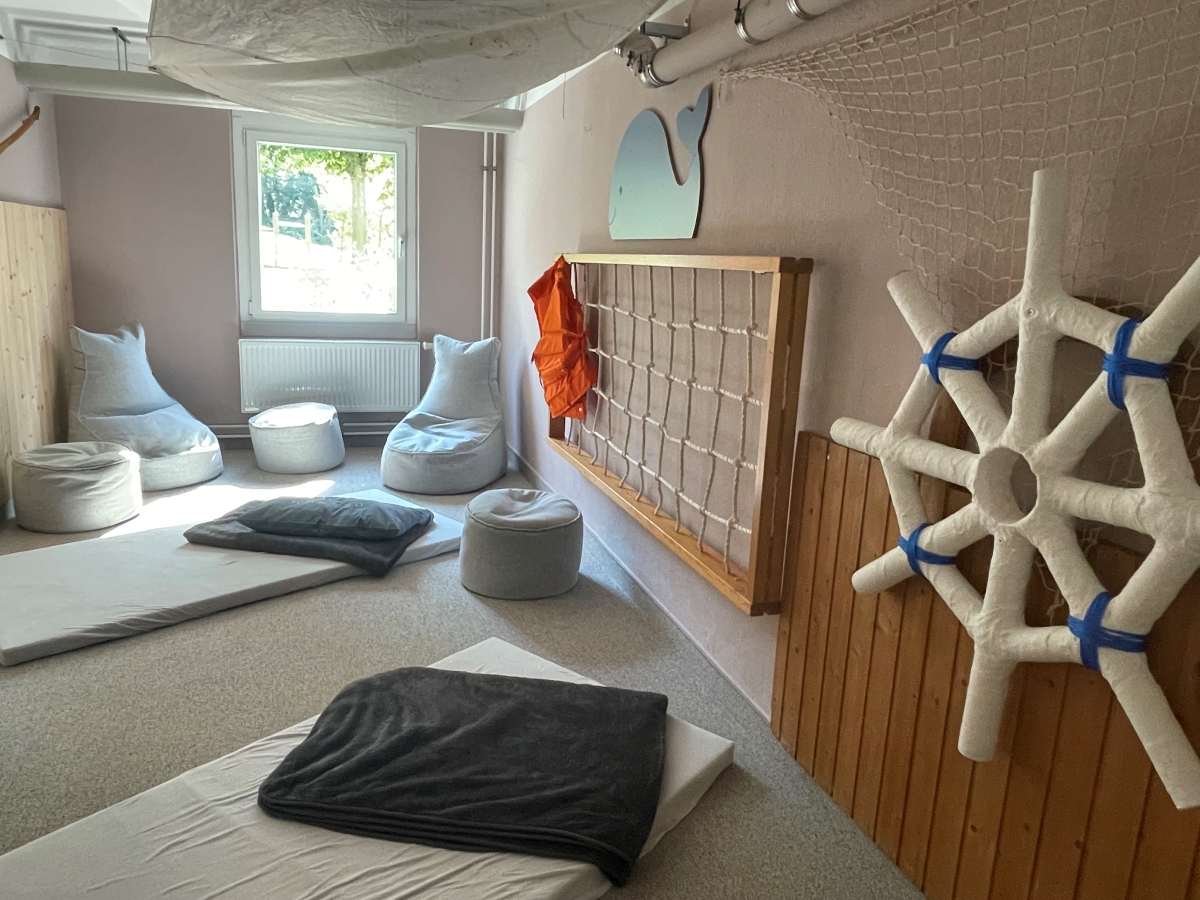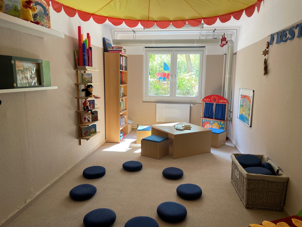 Besondere Erlebnisräume befinden sich im Souterrain: kindgerecht gestaltet, sicher ausgestattet und voller Möglichkeiten für fantasievolles Spiel und kreative Entfaltung. Hier laden unter anderem ein Bällebad, ein Bewegungsraum mit Kletterwand, eine Kinderwerkstatt, die „Kajüte“ als Entspannungsraum, eine Erzählerwerkstatt, ein Bauzimmer, ein Forscherraum, eine Kinderbibliothek sowie unsere „Pinselinsel“ zum Entdecken ein. Mit der „Quasselstube“ steht zudem ein eigener Raum für Elterngespräche zur Verfügung. Das „Lütt Hus“ als Rollenspielzimmer und der „Stifteklub“ ergänzen das vielseitige Raumkonzept.