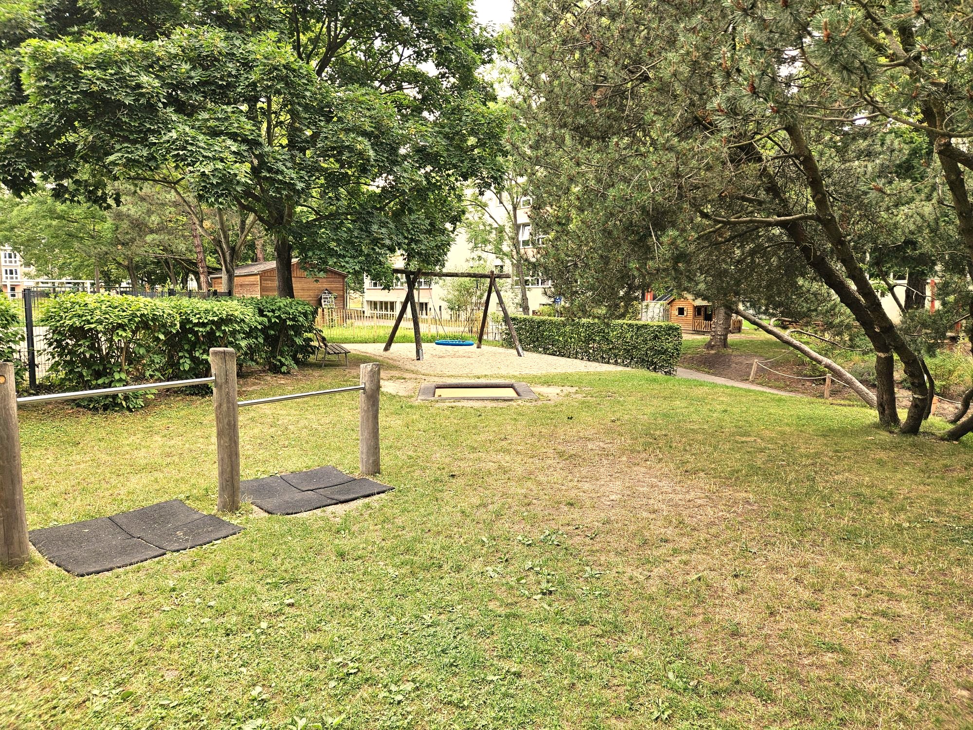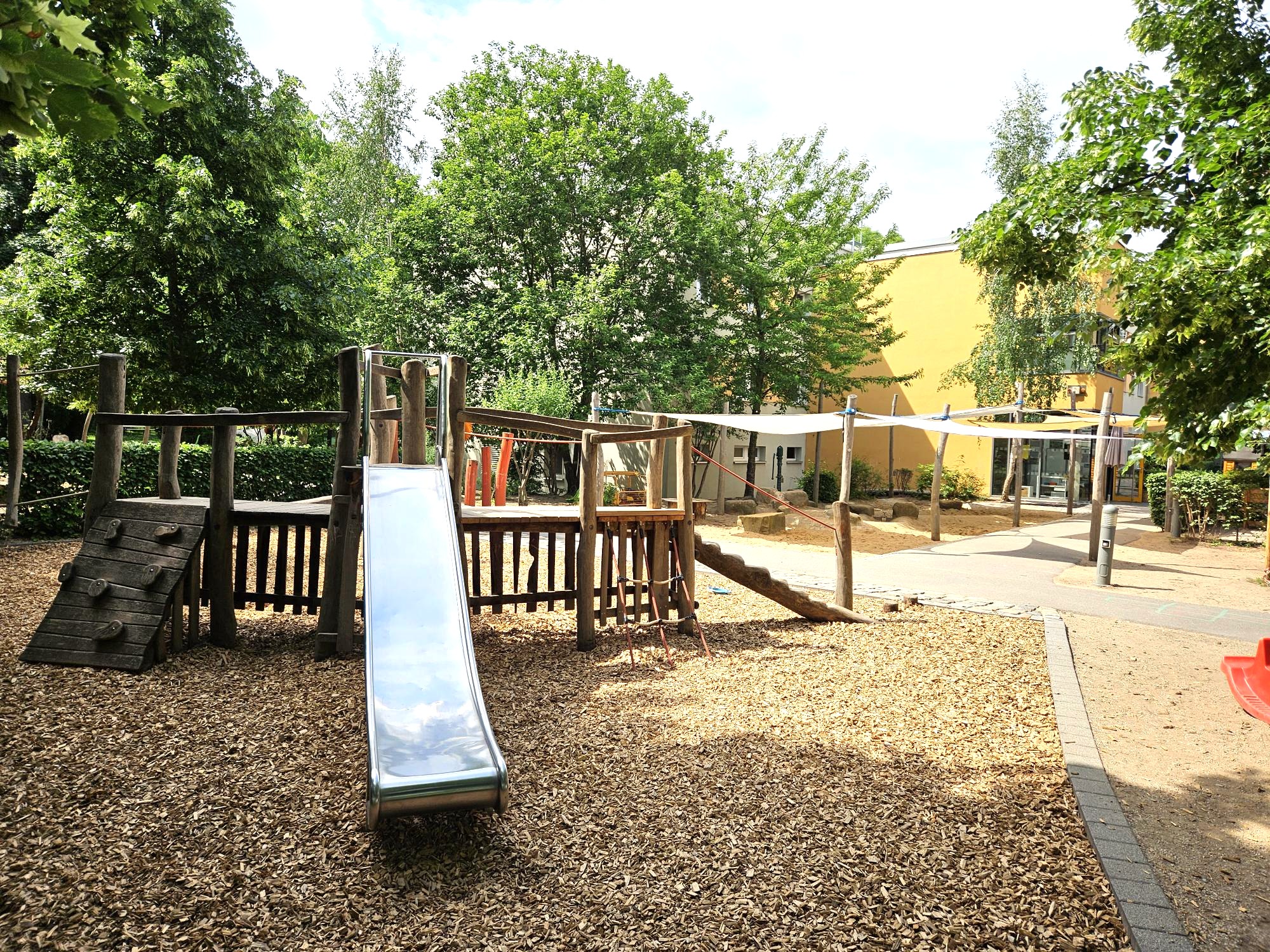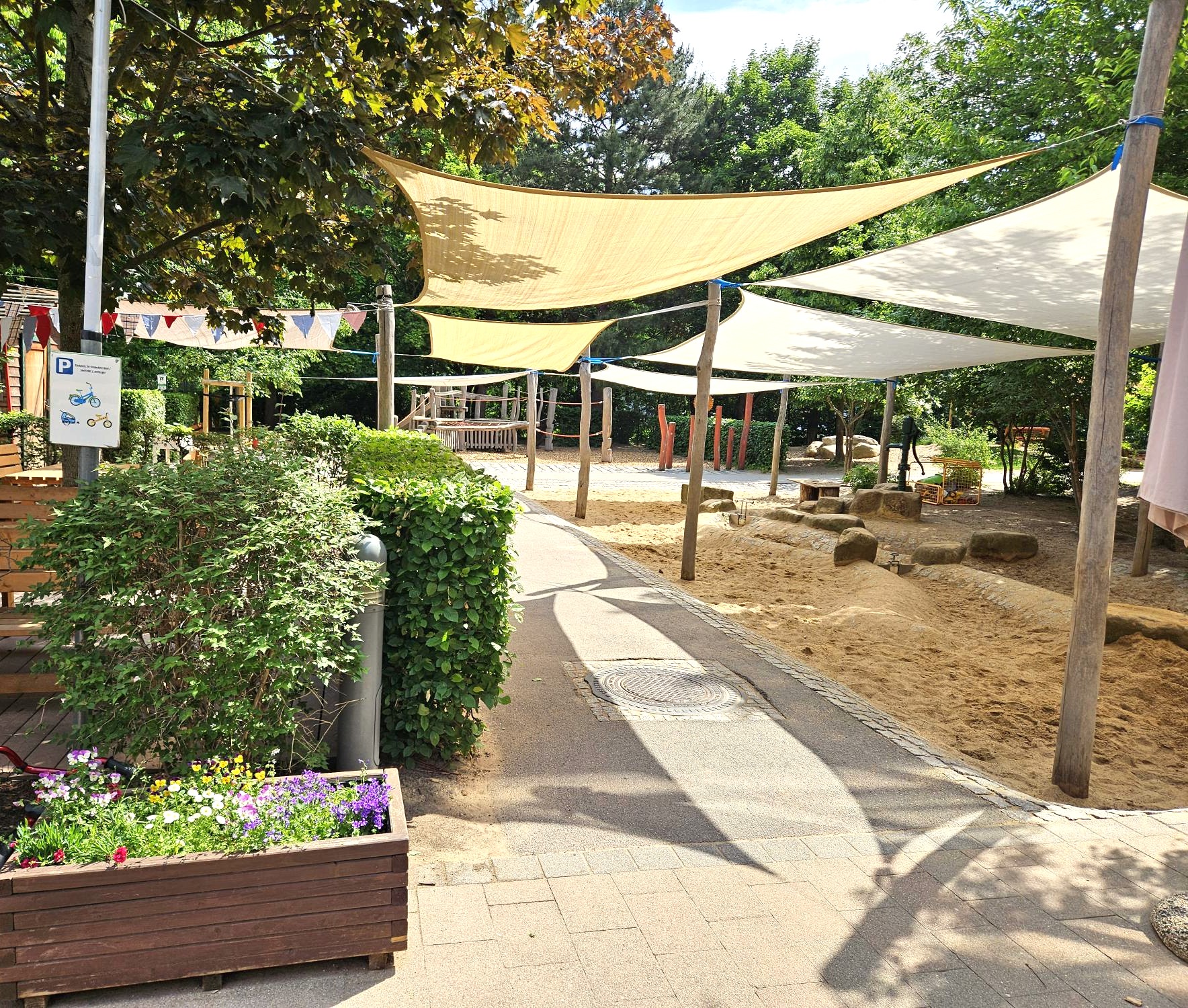 Unser weitläufiges Außengelände lädt zum Forschen, Entdecken und Bewegen ein. Eine Matschanlage, ein Trampolin, verschiedene Schaukeln und Klettermöglichkeiten, ein Barfußpfad sowie kleine Häuschen und Rückzugsorte bieten zahlreiche Anreize, die motorischen Fähigkeiten zu schulen, Grenzen auszutesten oder ins kreative Rollenspiel einzutauchen.