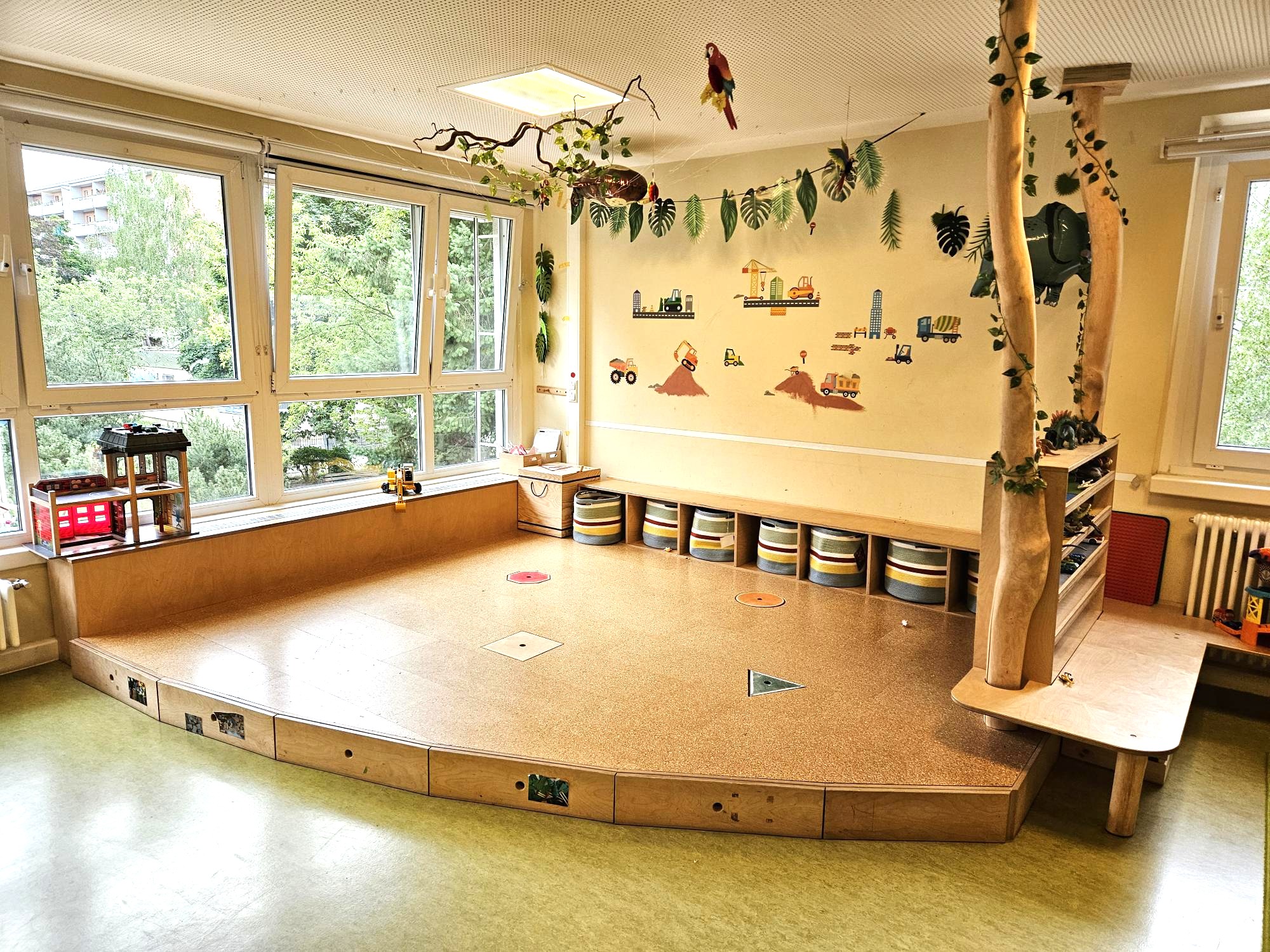 Die Kita ist baulich mit dem Hort der 37. Grundschule verbunden. Dadurch profitieren die Kinder von einer engen Kooperation, gemeinsamen Vorschulangeboten und erweiterten Nutzungsmöglichkeiten der Räume und Außenflächen.