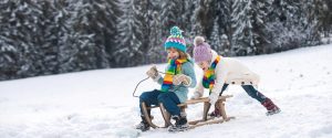 Funny children in snow ride on sled. Winter outdoors games. Happy Christmas family vacation concept. Kids enjoy the holiday.