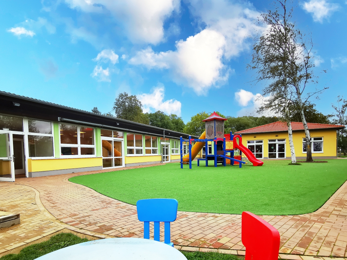 Seit 2019 ergänzt die Rosenower Kita unser Gelände. Auch sie wird von der JuS getragen. Seitdem treten wir als Bildungscampus Rosenow auf – ein Ort, an dem Schule, Kita und Hort Hand in Hand arbeiten.